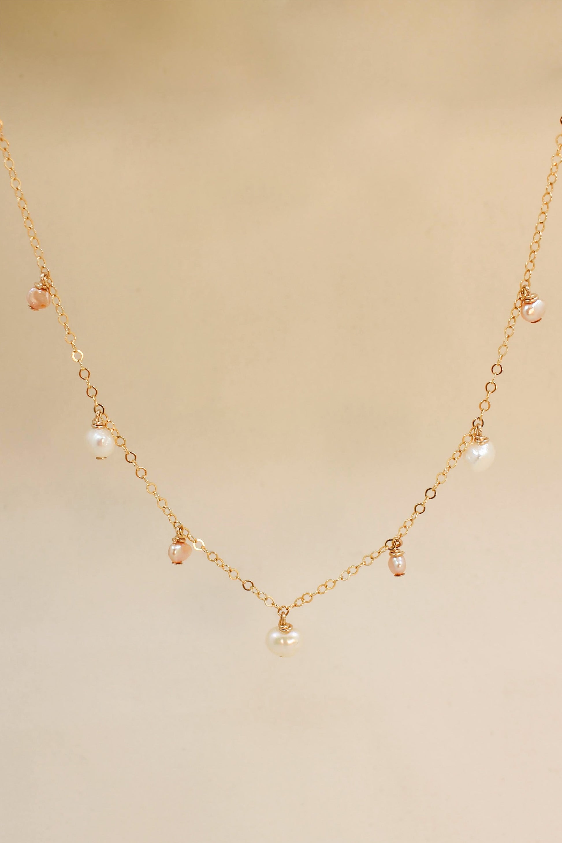 A row of striking pearls balanced on a delicate chain. The Emeri Necklace features three lustrous white freshwater pearls accentuated by dainty blush pink pearls for a soft, feminine touch. Perfect for layering or wearing solo for an elegant statement.